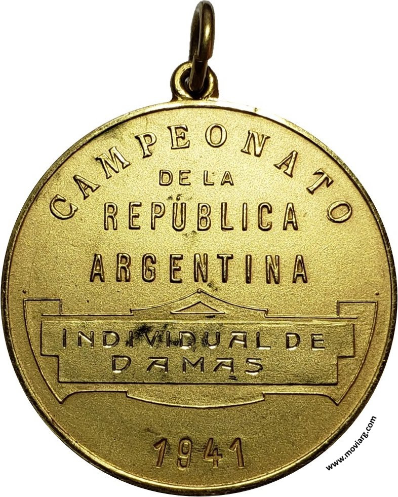 Anverso: ASOCIACION ARGENTINA DE LAWN TENNIS / BUENOS AIRES. Firma: PASTORINO Y SALA Reverso: CAMPEONATO / DE LA / REPÚBLICA / ARGENTINA / [ INDIVIDUAL DE ] / [ DAMAS ] / [ 1941 ] Canto: Liso. [ 18K ] Referencia: | |