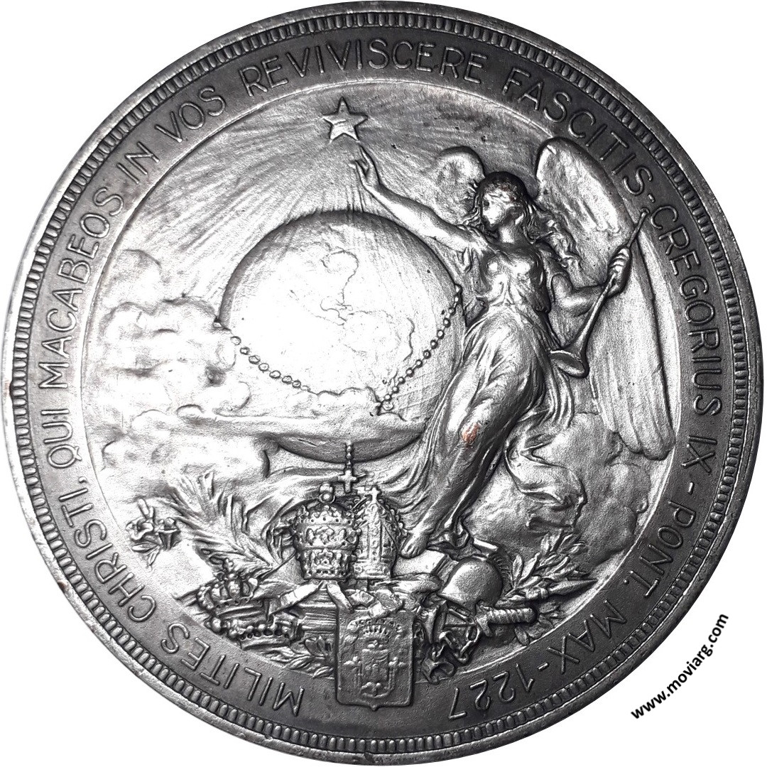 Colección MDS Anverso: MILITES CHRISTI, QUI MACABEOS IN VOS REVIVISCERE FASCITIS - GREGORIUS IX - PONT. MAX - 1227Reverso: REPUBLICA ARGENTINA / PARA PERPETUA MEMORIA / CONMEMORANDO EL XIX CENTENARIO / DE LA REDENCIÓN DEL MUNDO / POR N. SEÑOR Y REY JESUCRISTO, / EL VII DE LA CANONIZACIÓN DEL GLORIOSISIMO / PATRIARCA SANTO DOMINGO DE GUZMÁN, / EL VI DEL PRECIOSO TRÁNSITO DE LA BIENAVENTURADA / IMELDA LAMBERTINI, VIRGEN O. P, / Y EN HOMENAJE DE FERVOROSA ADHESIÓN / AL XXXII CONGRESO EUCARISTICO INTERNACIONAL, / EN BUENOS AIRES, / LA VENERABLE ORDEN TERCERA DE SANTO DOMINGO, / EN JUBILOSA COMUNIÓN CON LA INCLITA ORDEN / DE PREDICADORES, CON EL VENERABLE EPISCOPADO, / CLERO SECULAR Y REGULAR Y PUEBLO ARGENTINO, / Y CON TODOS LOS CRISTIANOS DEL ORBE, / BAJO EL FELIZ Y GLORIOSO REINADO DE SU / SANTIDAD PIO XI PONTIFICE SUMO, / CELEBRA EL PRIMER CONGRESO / NACIONAL TERCIARIO / DOMINICANO / TUCUMAN - BUENOS AIRES - CORDOBA / JULIO - AGOSTO / AÑO SANTO DE 1934. Firma: GOTTUZZO Y PIANA Referencia: | |