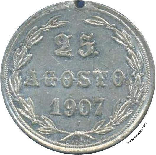 | Año: 1907 Obras y Servicios Públicos Metal: Peltre - Peso: 8.3gr - Módulo: 29mm - Rotación: 12hrs Grabador: Santiago Caccia | |
