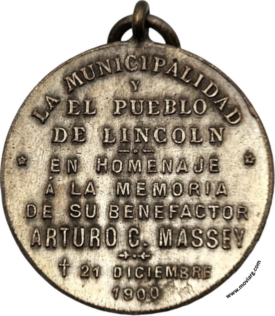 Anverso: Reverso: LA MUNICIPALIDAD / Y / EL PUEBLO / DE LINCOLN / EN HOMENAJE / Á LA MEMORIA / DE SU BENEFACTOR / ARTURO C. MASSEY / 21 DICIEMBRE / 1900 Referencia: | |