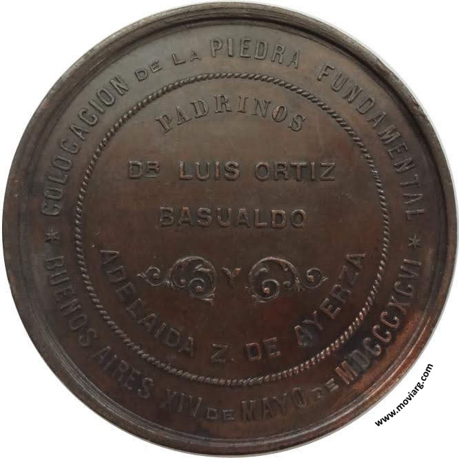 Anverso: IGLESIA DE NTRA SRA DEL ROSARIO DE POMPEYA / PATRONO MENOR SN ANTONIO DE PADUA. Firma: ORZALI B. Y C. Reverso: COLOCACION DE LA PIEDRA FUNDAMENTAL / BUENOS AIRES XIV DE MAYO DE MDCCCXCVI / PADRINOS / DR LUIS ORTIZ / BASUALDO / Y / ADELAIDA Z. DE AYERZA Referencia: BURZIO-2456 | |