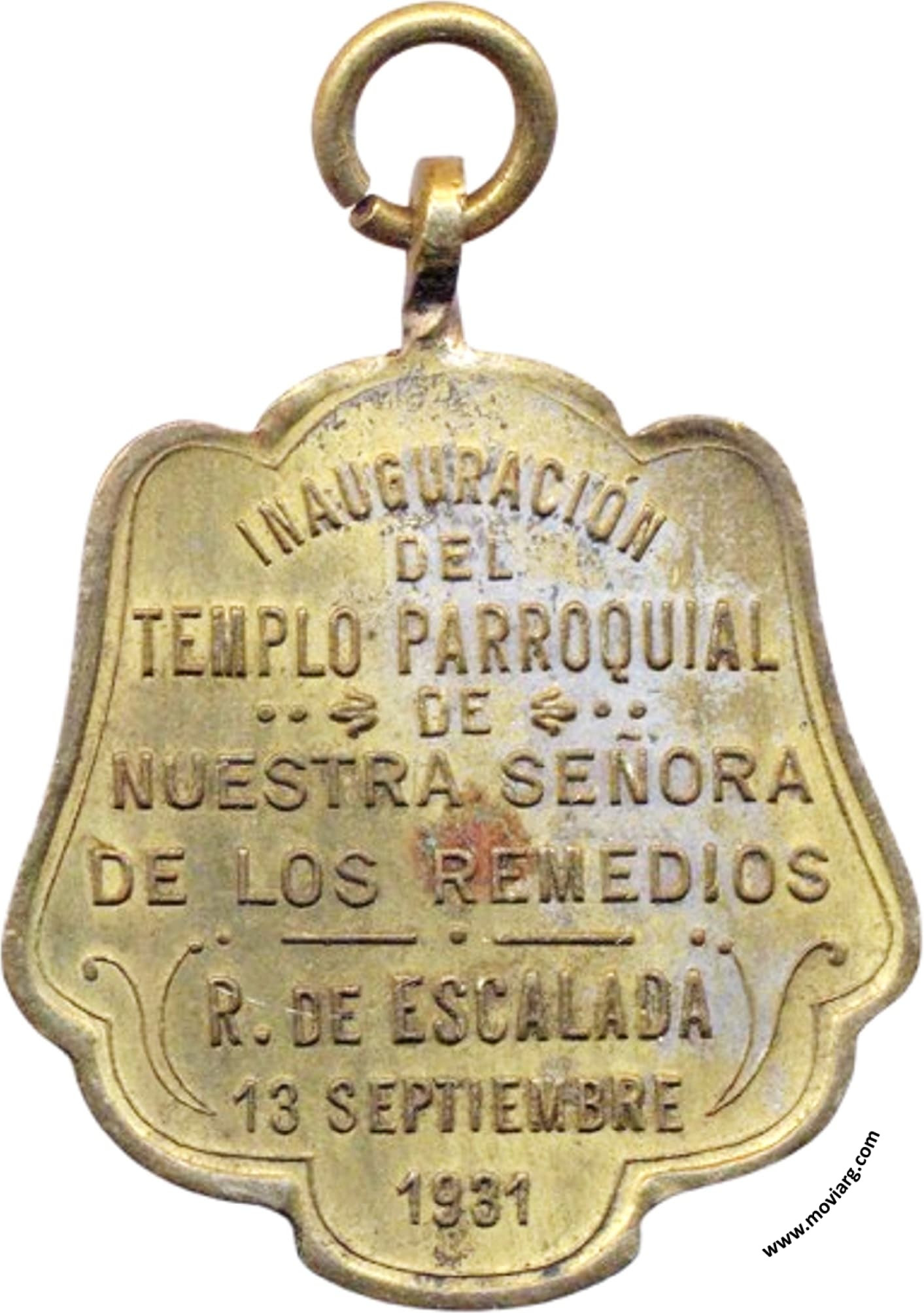 Anverso: NUESTRA SEÑORA / DE LOS REMEDIOS. Firma: CONSTANTE ROSSI Reverso: INAUGURACIÓN / DEL / TEMPLO PARROQUIAL / DE / NUESTRA SEÑORA / DE LOS REMEDIOS / R. DE ESCALADA / 13 SEPTIEMBRE / 1931 Referencia: | |