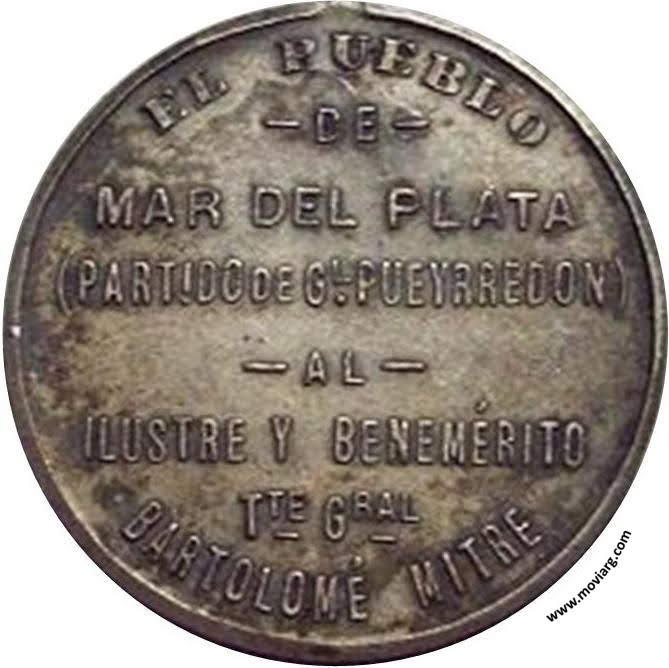 Anverso: 1821 26 DE JUNIO 1901. Firma: B. Y R. Reverso: EL PUEBLO / DE / MAR DEL PLATA / ( PARTIDO DE GL.PUEYRREDON ) / AL / ILUSTRE Y BENEMERITO / TTE. GRAL. / BARTOLOME MITRE Referencia: ROSA-12 (M80) | |
