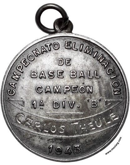 Anverso: CLUB DE GIMNASIA Y ESGRIMA / MENS SANA IN CORPORE SANO / B. AIRES. Campo: CGE Reverso: CAMPEONATO ELIMINACIÓN / DE / BASE BALL / CAMPEÓN / 1A. DIV. 'B' / [ CARLOS THEULE ] / 1943 Canto: Liso. PLATA Referencia: | |