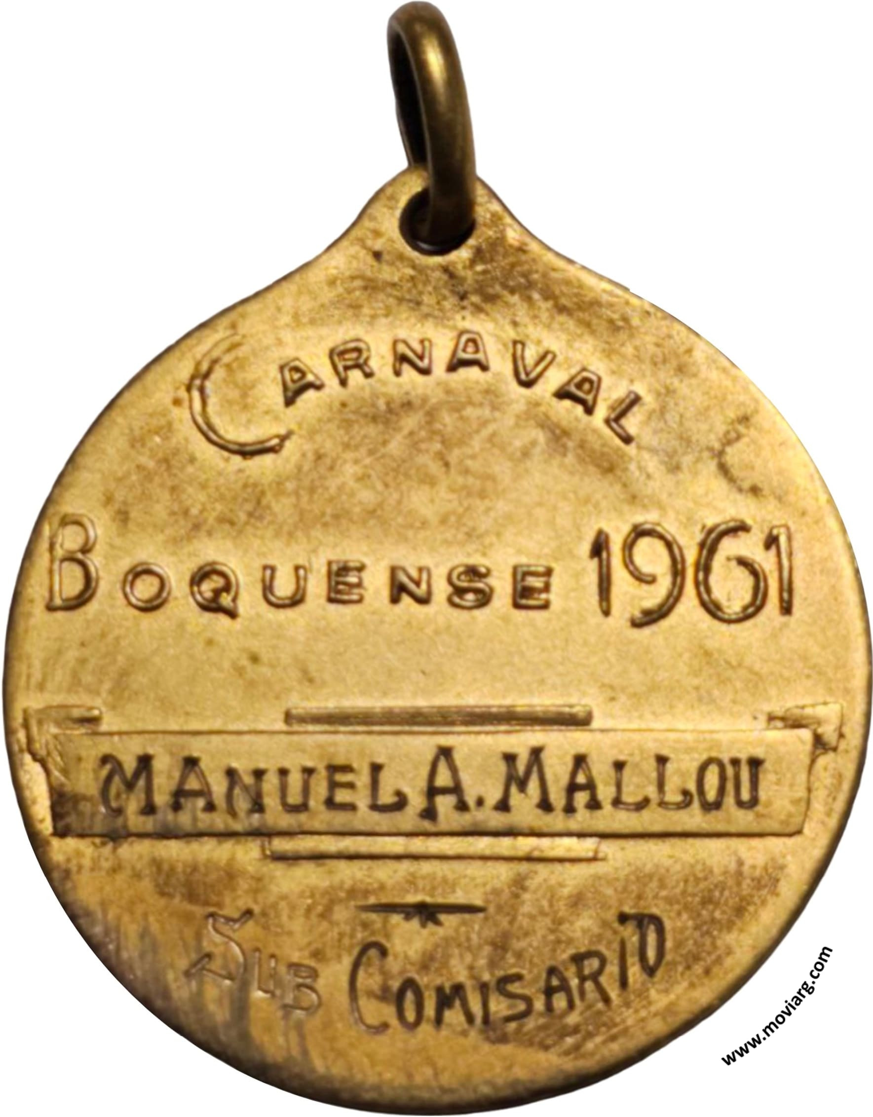 Anverso: AMIGOS DE LA CALLE OLAVARRIA Reverso: CARNAVAL BOQUENSE / 1961 / [ MANUEL A. MALLOU ] / [ SUB COMISARIO ] Referencia: | |