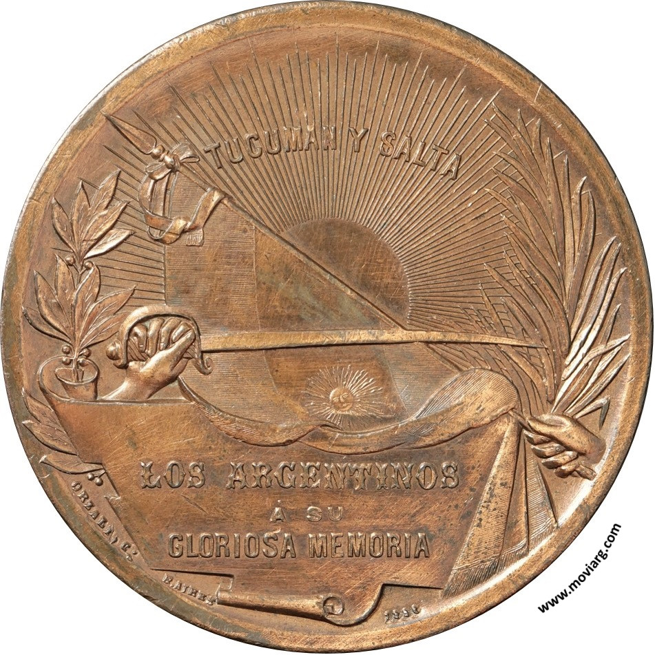Anverso: GENERAL EN GEFE (sic) DE LOS EJERCITOS DE LA PATRIA. Campo: M. BELGRANO Reverso: TUCUMAN Y SALTA / LOS ARGENTINOS / A SU / GLORIOSA MEMORIA. Firma: ORZALI B. Y C. Referencia: | |