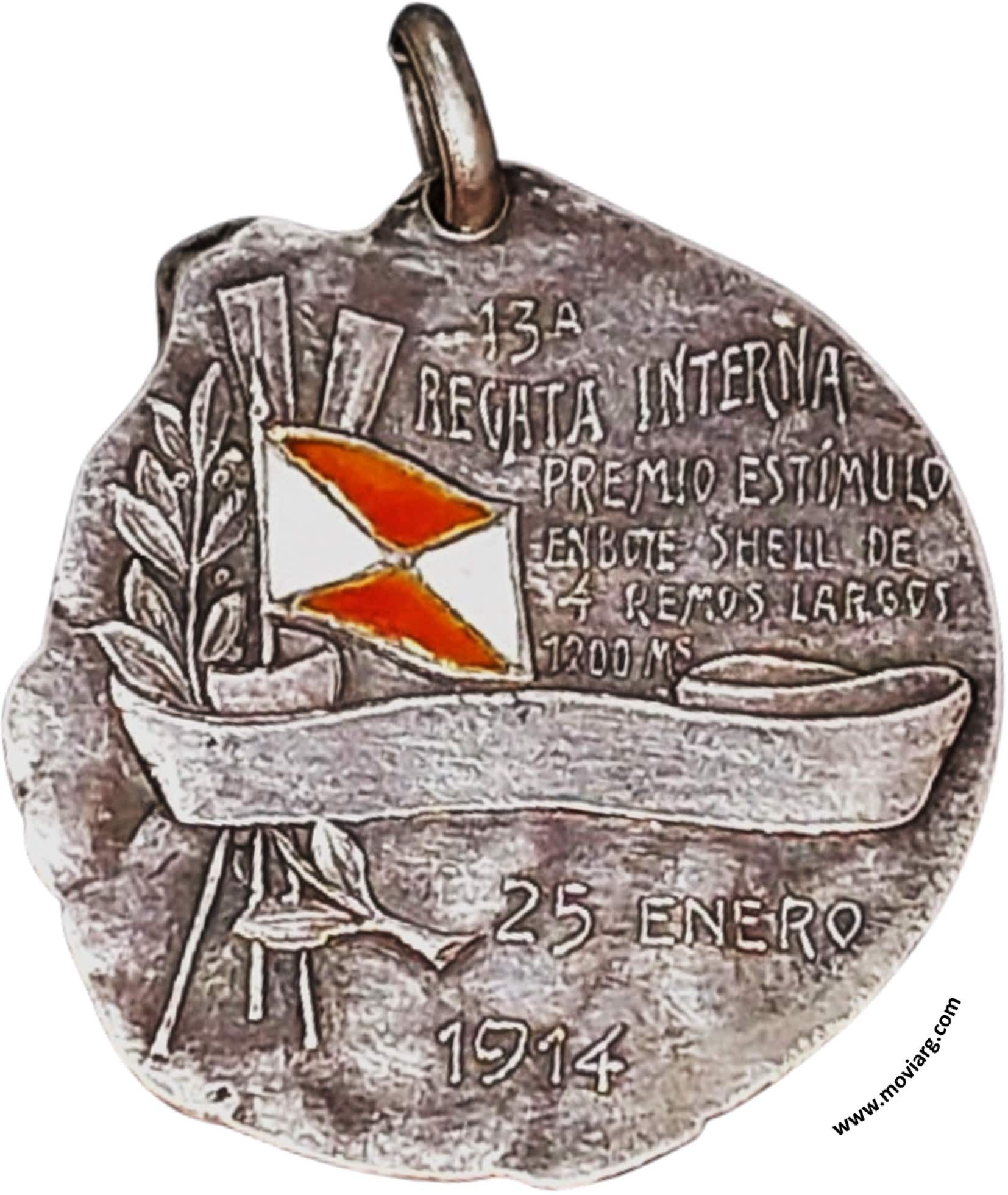 Anverso: CLUB REGATAS / LA MARINA Reverso: 13A. / REGATA INTERNA / PREMIO ESTÍMULO / EN BOTE SHELL DE / 4 REMOS LARGOS / 1200 MS. / 25 ENERO / 1914 Referencia: | |