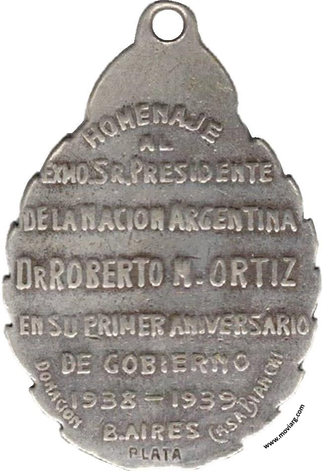 Anverso: Reverso: HOMENAJE / AL / EXMO. SR. PRESIDENTE / DE LA NACION ARGENTINA / DR. ROBERTO M. ORTIZ / EN SU PRIMER ANIVERSARIO / DE GOBIERNO / 1938 - 1939 / B. AIRES. Exergo: DONACION [ PLATA ]. Firma: CASA BIANCHI Referencia: | |