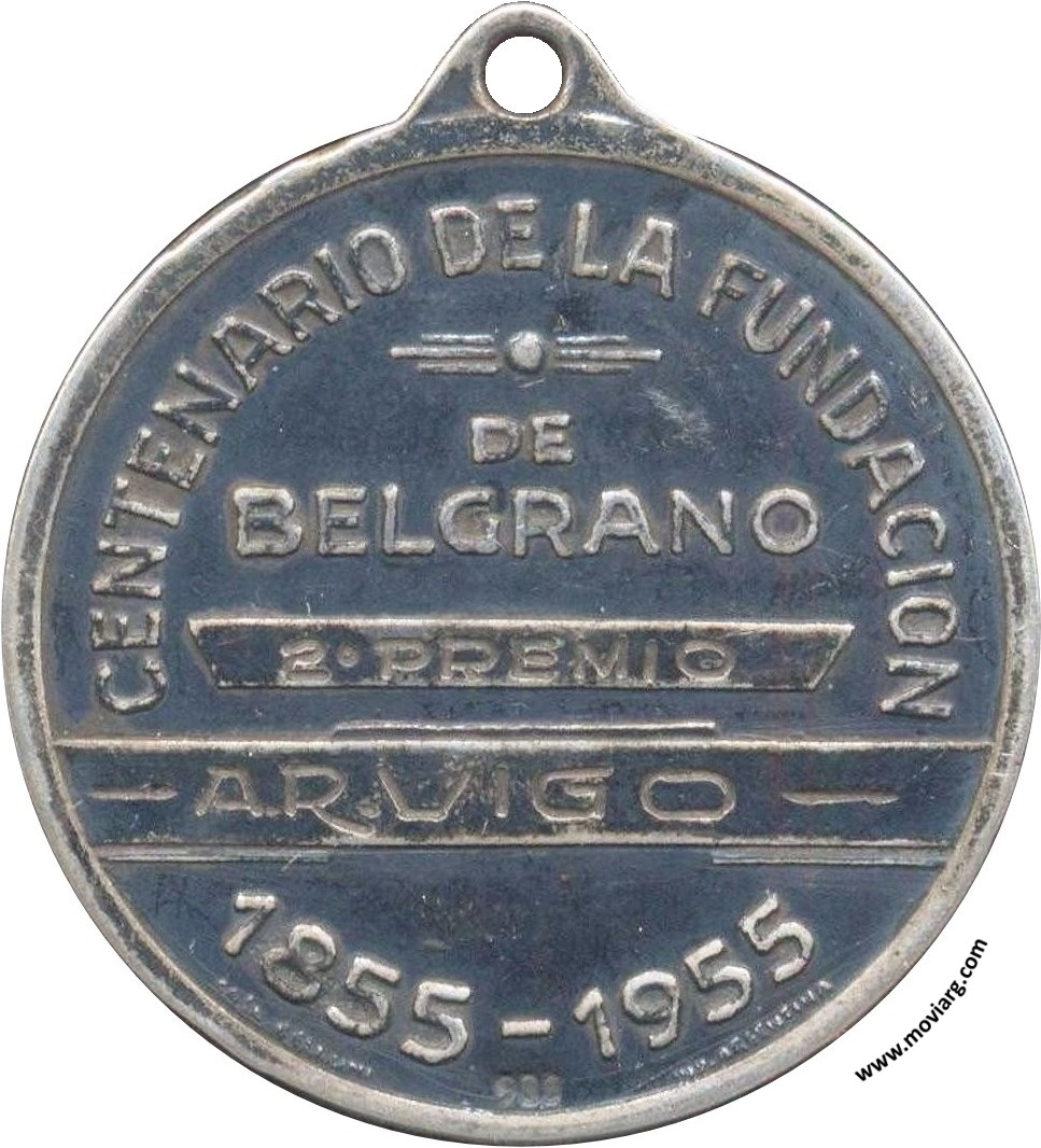 Anverso: MUNICIPALIDAD DE LA CIUDAD DE BUENOS AIRES Reverso: CENTENARIO DE LA FUNDACION / DE / BELGRANO / [ 2° PREMIO ] / [ A. R. VIGO ] / 1855 - 1955. Firma: CASA BELLUNI / IND. ARGENTINA. Exergo: [ 800 ] Referencia: | |