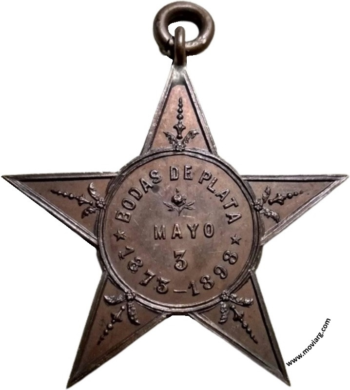 Colección @parryyanumismatico Anverso: BODAS DE PLATA / MAYO / 3 / 1873 - 1897Reverso: GIULLERMO (sic) ALMANZA / LEONOR GONZALEZ Referencia: | |