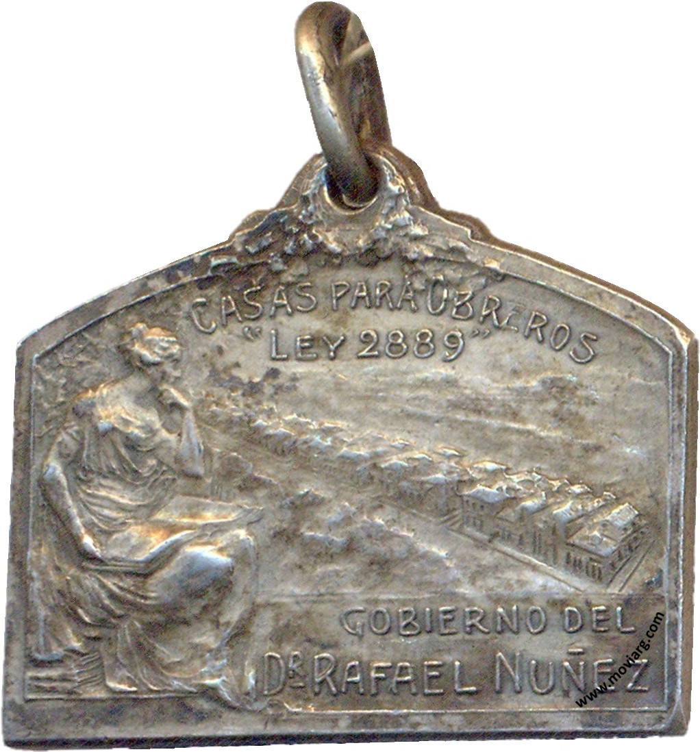 Anverso: CASAS PARA OBREROS / " LEY 2889 " / GOBIERNO DEL / DR. RAFAEL NUÑEZ Reverso: COLOCACION / DE LA / PIEDRA FUNDAMENTAL / DICIEMBRE DE 1921 / GOBIERNO / DEL / DR. JERÓNIMO / DEL BARCO Referencia: | |