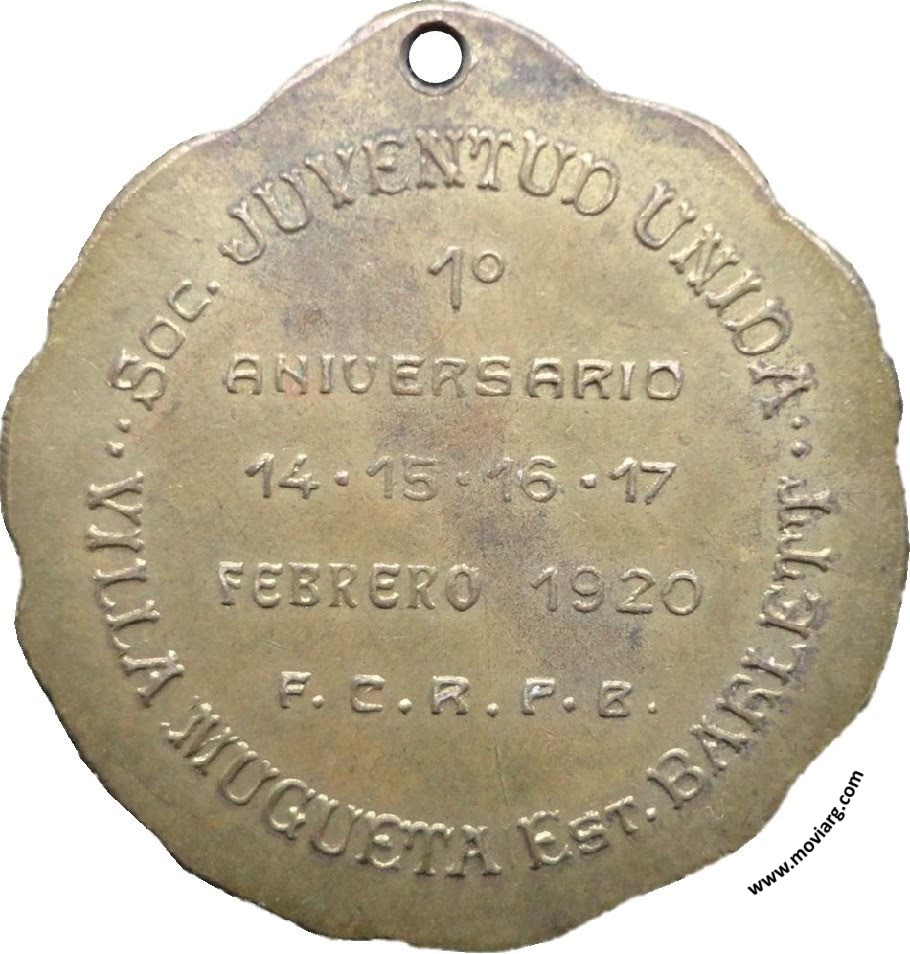 Anverso: Reverso: SOC. JUVENTUD UNIDA / VILLA MUGUETA EST. BARLETT / 1° / ANIVERSARIO / 14 · 15 · 16 · 17 / FEBRERO 1920 / F.C.R.P.B. Referencia: | |