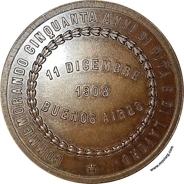 Anverso: VERITÁ GIUSTIZIA / PATRIA UMANITÁ / RISP .·. LOG .·. CAPITOL .·. / UNIONE ITAL .·. Reverso: COMMEMORANDO CINQUANTA ANNI DI VITA E DI LAVORO / 11 DICIEMBRE / 1908 / BUENOS AIRES Referencia: | |