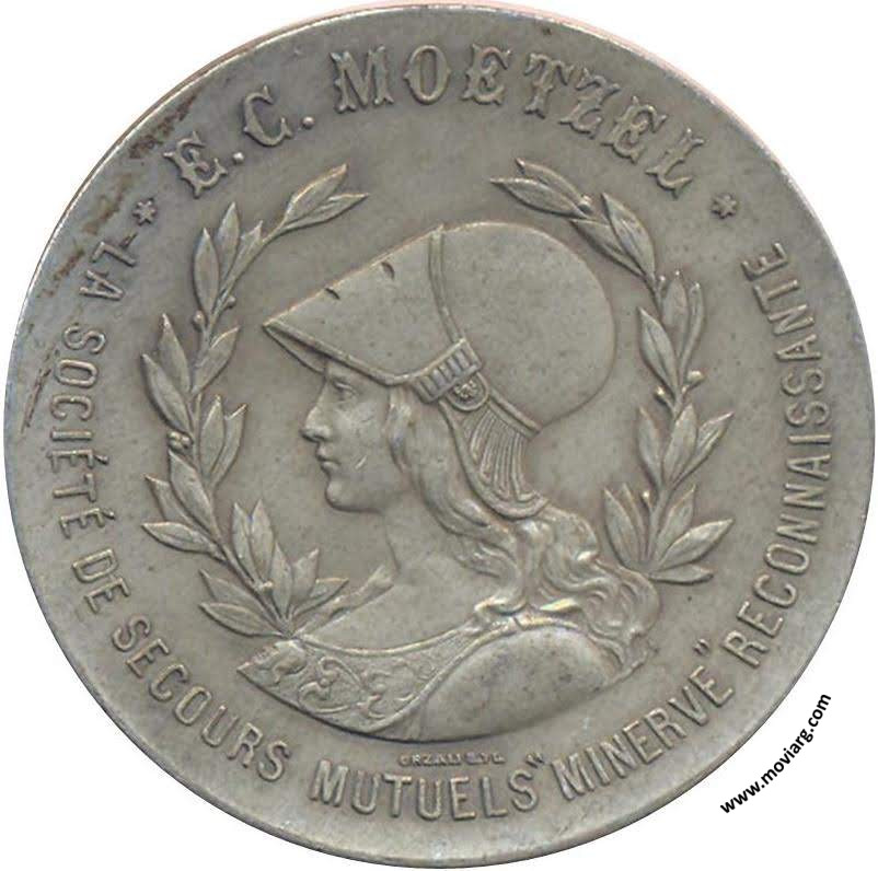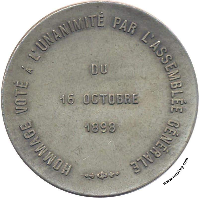 Anverso: E. C. MOETZEL / LA SOCIÉTÉ DE SECOURS MUTUELS "MINERVE" RECONNASSANTE. Firma: ORZALI B. Y C. Reverso: HOMMAGE VOTÉ Á L'UNANIMITÉ PAR L'ASSEMBLEÉ GÉNÉRALE / DU / 16 OCTOBRE / 1898 Referencia: BURZIO-3326 | |
