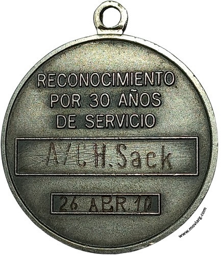 Anverso: REPUBLICA ARGENTINA / EJERCITO ARGENTINO Reverso: RECONOCIMIENTO / POR 30 AÑOS / DE SERVICIO / [ A/C H. SACK ] / [ 26 ABR 10 ] Referencia: | |