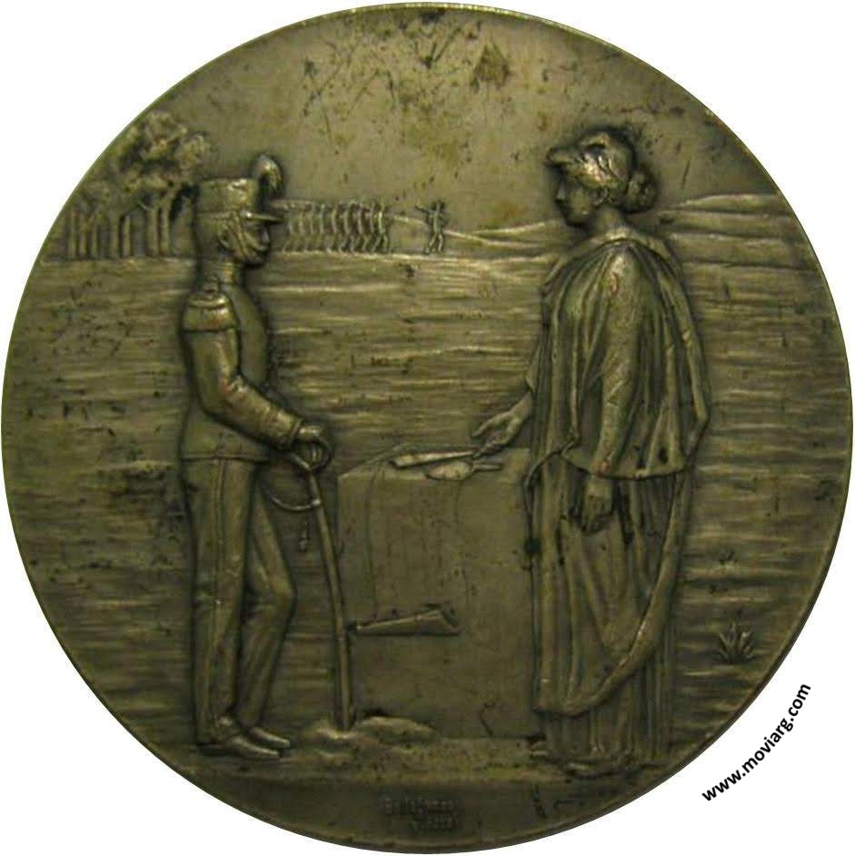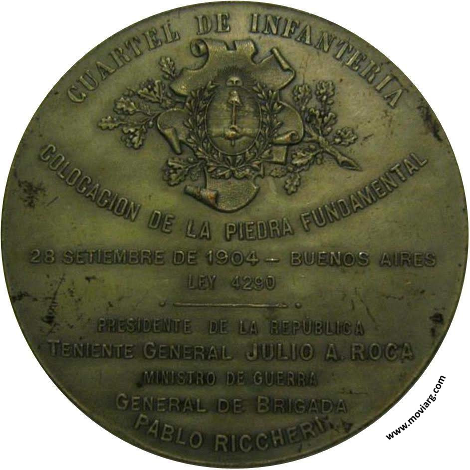 Anverso: Firma: BELLAGAMBA / Y ROSSI Reverso: CUARTEL DE INFANTERIA / COLOCACION DE LA PIEDRA FUNDAMENTAL / 28 SETIEMBRE DE 1904 - BUENOS AIRES / LEY 4290 / PRESIDENTE DE LA REPÚBLICA / TENIENTE GENERAL JULIO A. ROCA / MINISTRO DE GUERRA / GENERAL DE BRIGADA / PABLO RICCHERI Referencia: BURZIO-413 | |