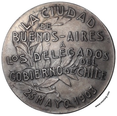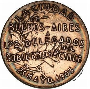 Anverso: AVSPICIVM · MELIORIS · AEVI · . Firma: CASANOVAS / Y HORTA / BS. AIRES Reverso: LA CUIDAD / DE / BUENOS - AIRES / Á / LOS DELEGADOS / DEL / GOBIERNO DE CHILE / 25 MAYO 1903 Referencia: | |
