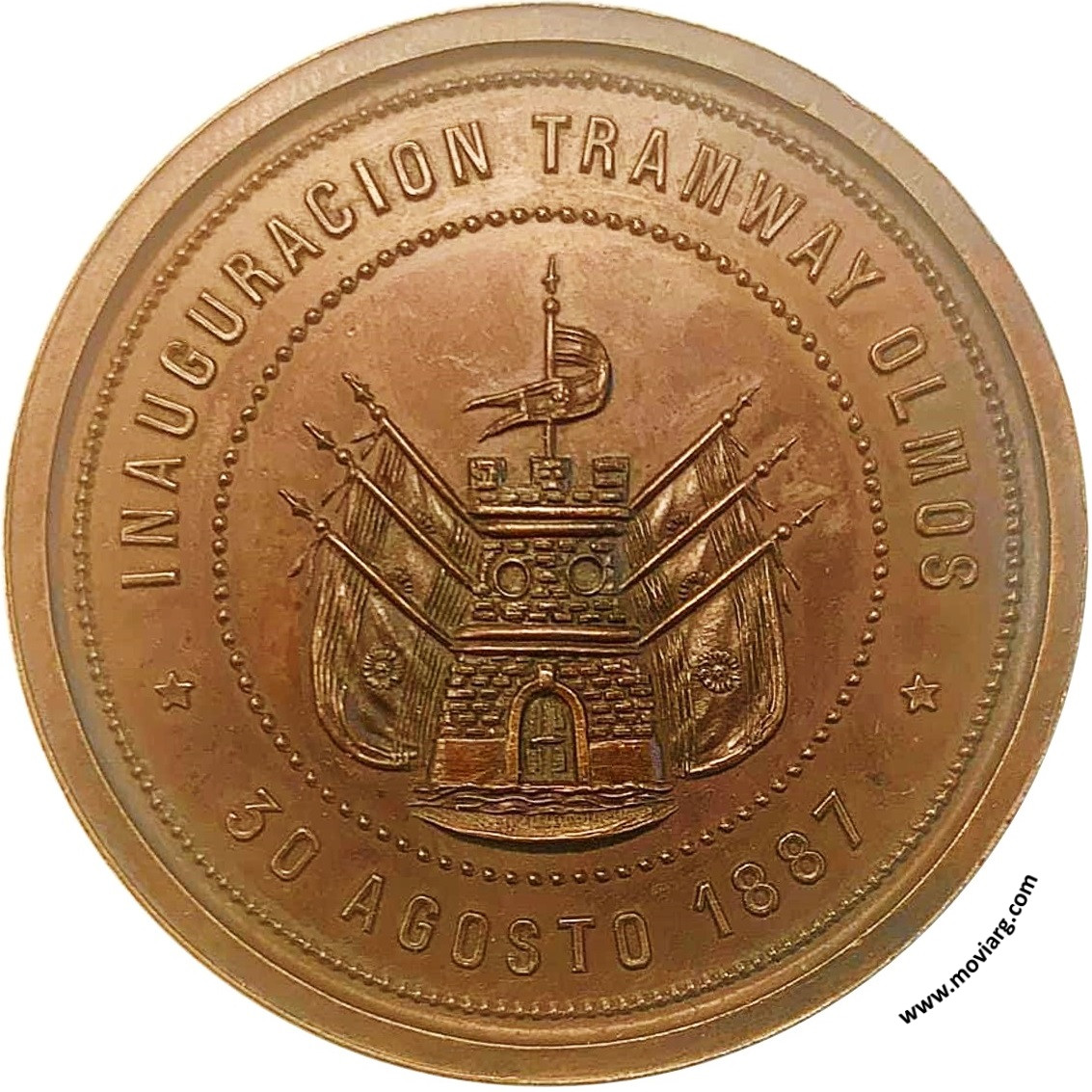 Anverso: SOCIEDAD FOMENTO 3° ABAJO / VILLA NUEVA Reverso: INAUGURACION TRAMWAY OLMOS / 30 AGOSTO 1887 Referencia: | |