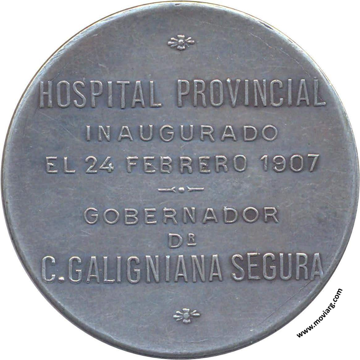 Anverso: PROVINCIA DE MENDOZA / OBRAS PÚBLICAS Reverso: HOSPITAL PROVINCIAL / INAUGURADO / EL 24 FEBRERO 1907 / GOBERNADOR / DR. / C. GALIGNIANA SEGURA Referencia: | |