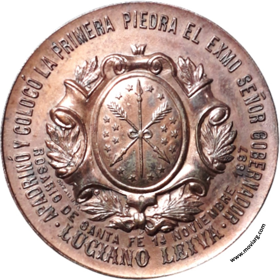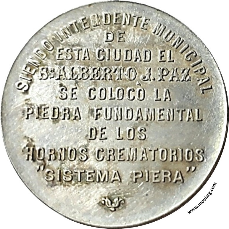 Anverso: APADRINÓ Y COLOCÓ LA PRIMERA PIEDRA EL EXMO. SEÑOR GOBERNADOR / LUCIANO LEIVA / ROSARIO DE SANTA FÉ 14 NOVIEMBRE 1897. Firma: ORZALI B. Y C. Reverso: SIENDO INTENDENTE MUNICIPAL / DE / ESTA CIUDAD EL / SR. ALBERTO J. PAZ / SE COLOCÓ LA / PIEDRA FUNDAMENTAL / DE LOS / HORNOS CREMATORIOS / " SISTEMA PIERA " Referencia: | |
