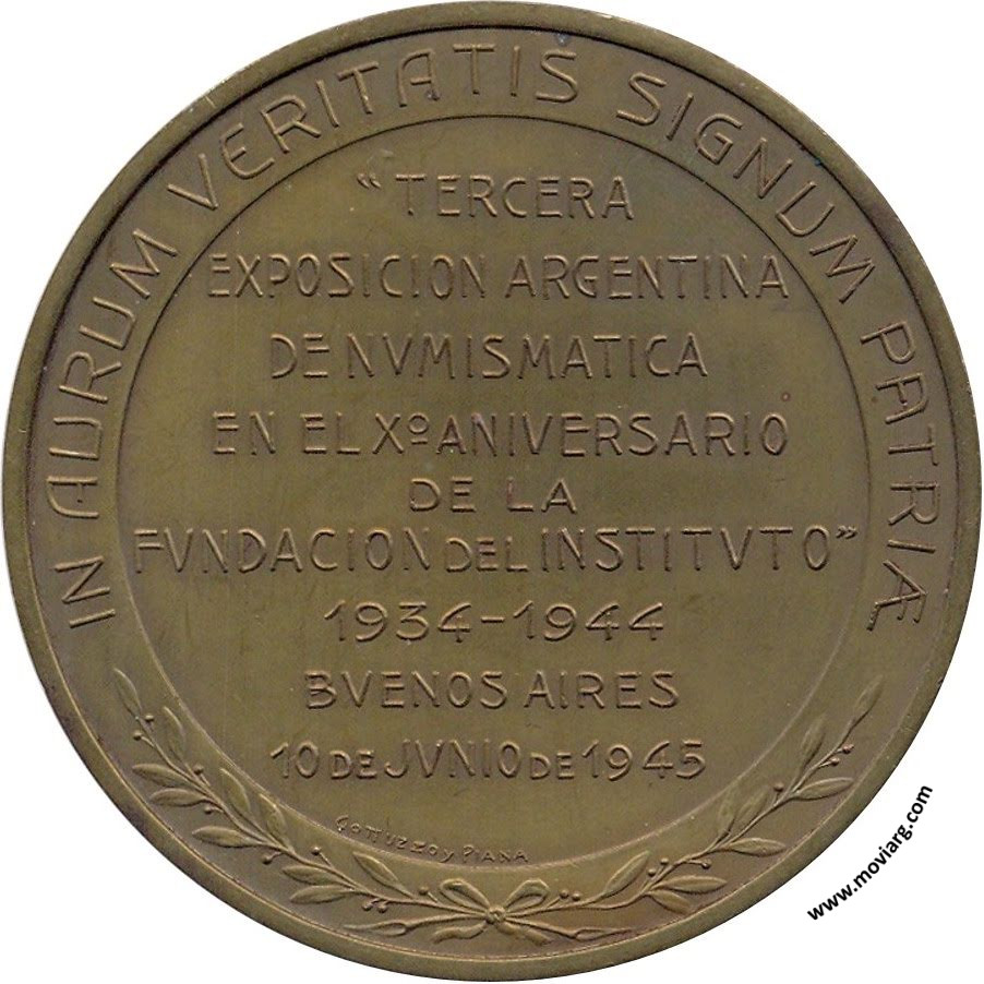 Anverso: INSTITUTO BONAERENSE DE NUMISMATICA Y ANTIGÜEDADES / FUNDADO EN 1872 / SEGUNDA EPOCA / 1934 Reverso: IN AURUM VERITATIS SIGNUM PATRIÆ / " TERCERA / EXPOSICION ARGENTINA / DE NUMISMATICA / EN EL X° ANIVERSARIO / DE LA / FUNDACION DEL INSTITUTO " / 1934 - 1944 / BUENOS AIRES / 10 DE JUNIO DE 1945. Firma: GOTTUZZO Y PIANA Referencia: | |