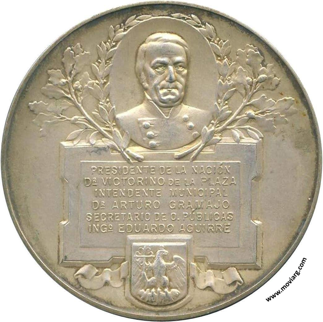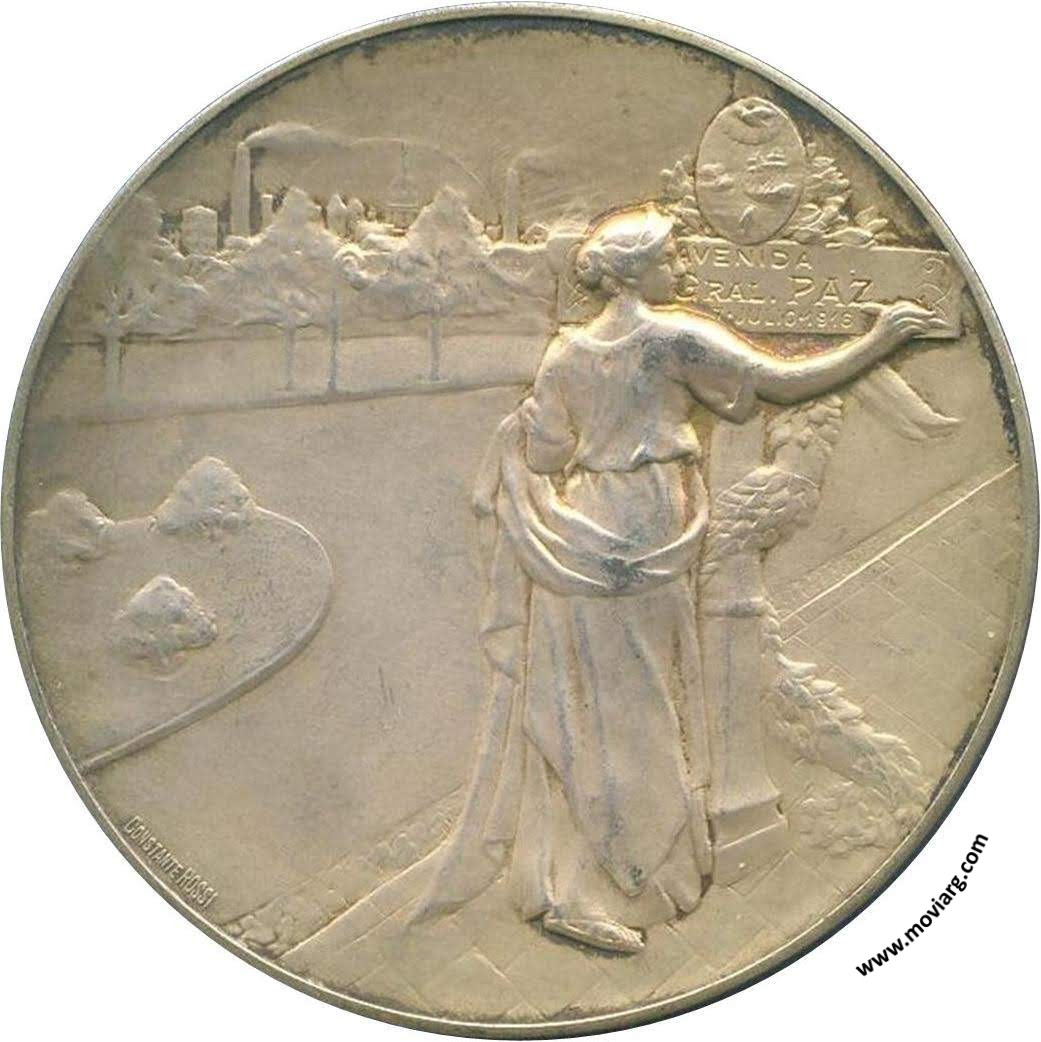 Anverso: AVENIDA / GRAL. PAZ / 7 JULIO 1916. Firma: CONSTANTE ROSSI Reverso: PRESIDENTE DE LA NACIÓN / DR. VICTORINO DE LA PLAZA / INTENDENTE MUNICIPAL / DR. ARTURO GRAMAJO / SECRETARIO DE O. PÚBLICAS / INGO. EDUARDO AGUIRRE Referencia: | |