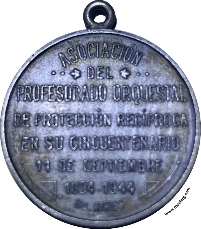 Colección Magnin Anverso: Campo: A.P.O. Firma: CONSTANTE ROSSIReverso: ASOCIACIÓN / DEL / PROFESORADO ORQUESTAL / DE PROTECCIÓN RECÍPROCA / EN SU CINCUENTENARIO / 11 DE SEPTIEMBRE / 1894 - 1944 / BS. AIRES Referencia: | |