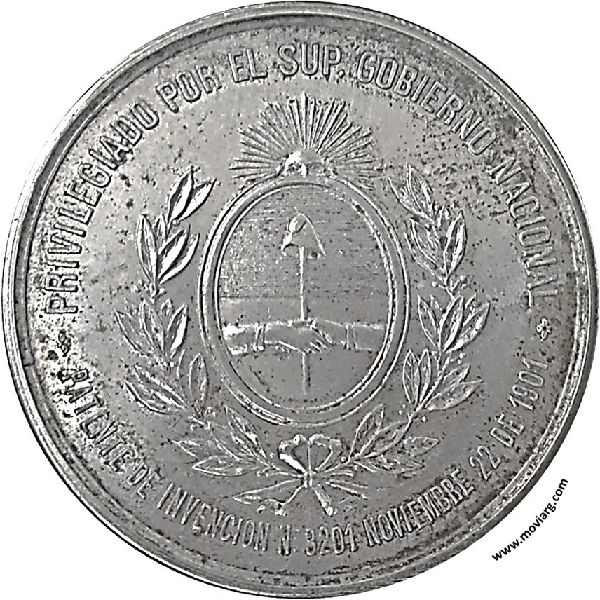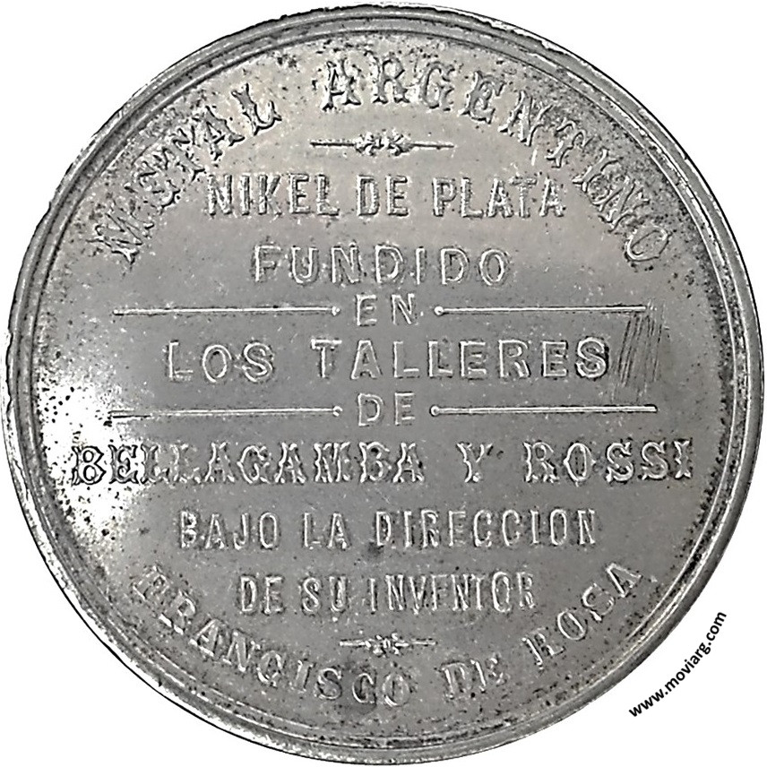 Anverso: PRIVILEGIADO POR EL SUP. GOBIERNO NACIONAL / PATENTE DE INVENCION N° 3201 NOVIEMBRE 22 DE 1901 Reverso: METAL ARGENTINO / NIKEL DE PLATA / FUNDIDO / EN / LOS TALLERES / DE / BELLAGAMBA Y ROSSI / BAJO LA DIRECCION / DE SU INVENTOR / FRANCISCO DE ROSA Referencia: | |