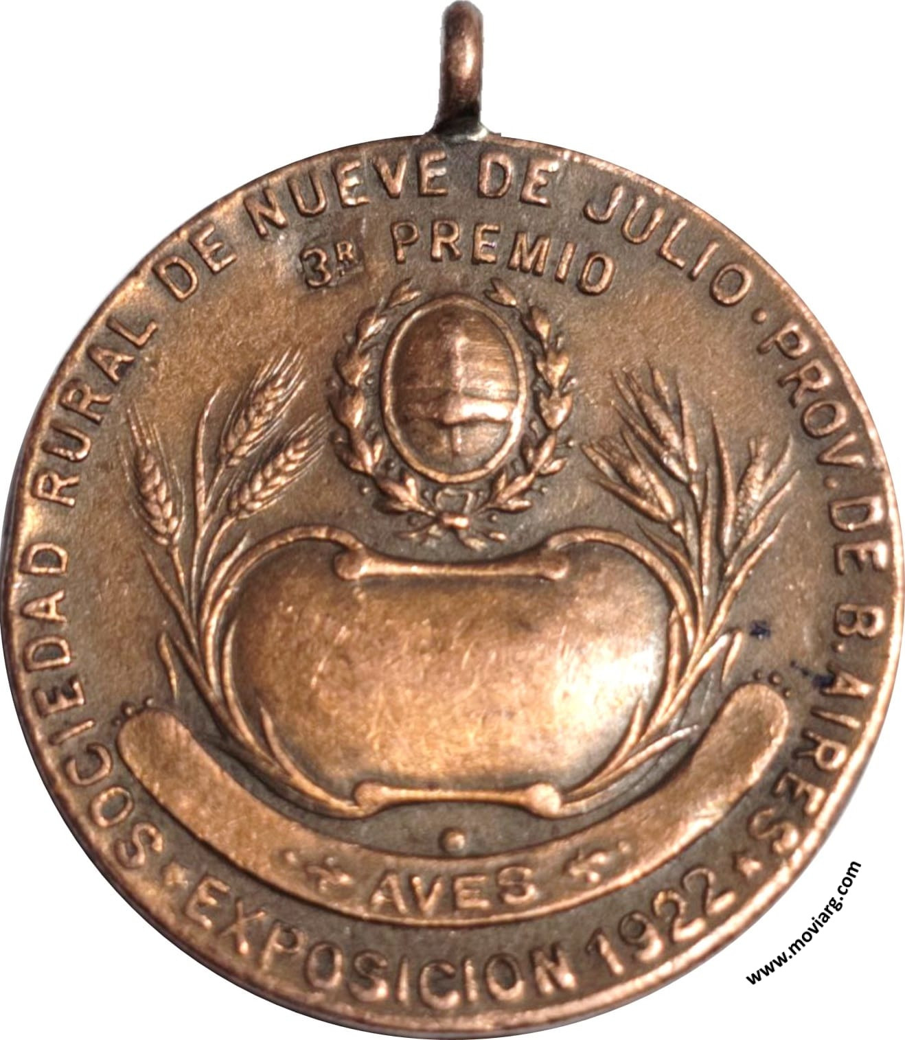 Anverso: SOCIEDAD RURAL DE NUEVE DE JULIO · PROV. DE B. AIRES / EXPOSICION 1922 / 3R. PREMIO / AVES Reverso: Firma: CONST. ROSSI Referencia: | |