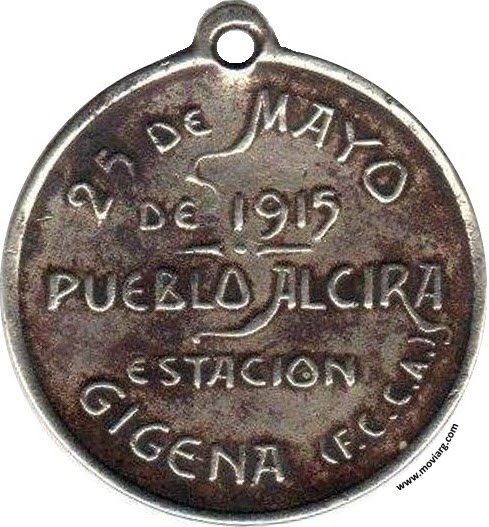 Anverso: Reverso: 25 DE MAYO / DE 1915 / PUEBLO ALCIRA / ESTACION / GIGENA ( F.C.C.A. ) Referencia: | |