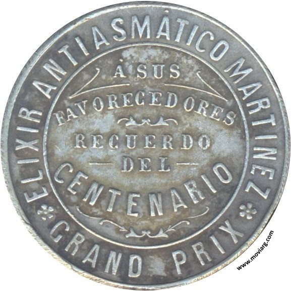 Anverso: 1910 Reverso: ELIXIR ANTIASMÁTICO MARTINEZ / GRAND PRIX / Á SUS / FAVORECEDORES / RECUERDO / - DEL - / CENTENARIO Referencia: | |