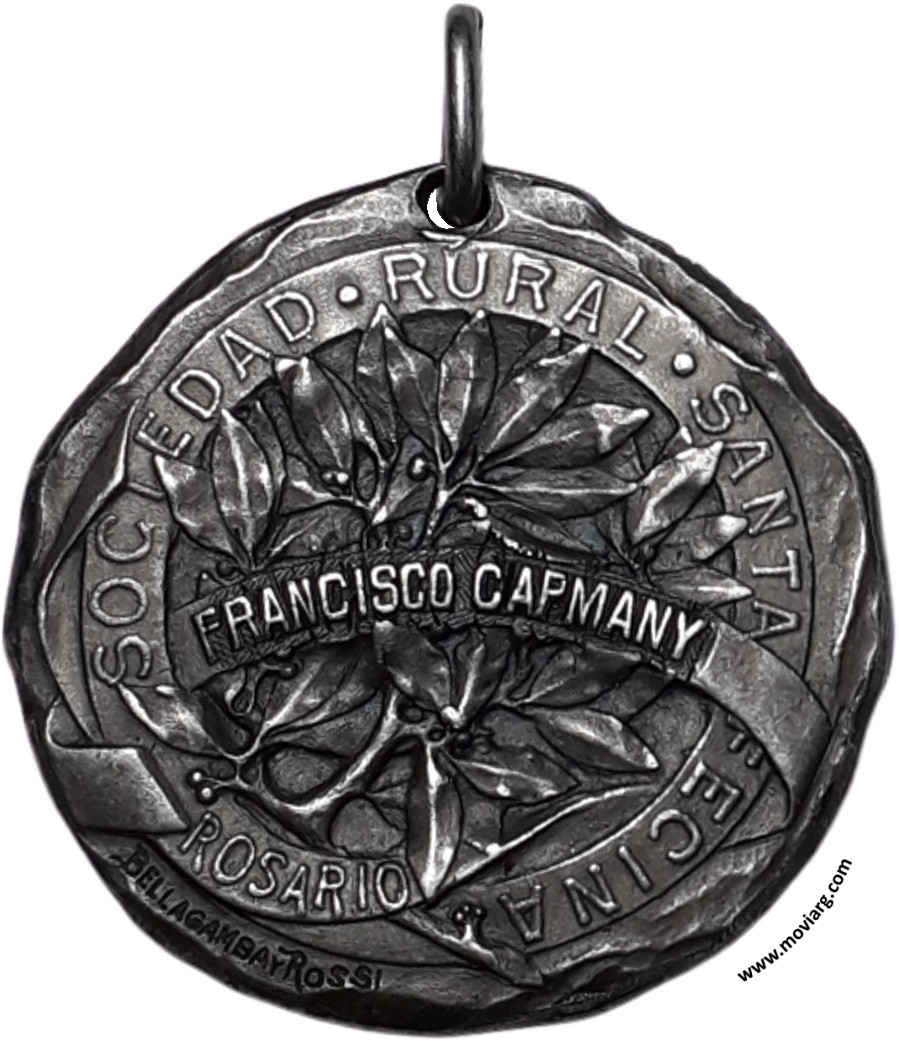 Anverso: Reverso: SOCIEDAD · RURAL · SANTAFECINA / [ FRANCISCO CAPMANY ] / ROSARIO. Firma: BELLAGAMBA Y ROSSI Canto: Liso. PLATA Referencia: | |
