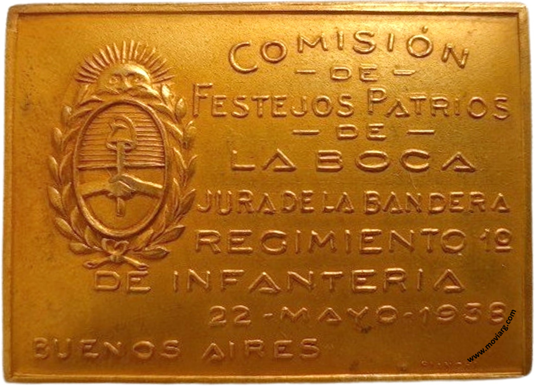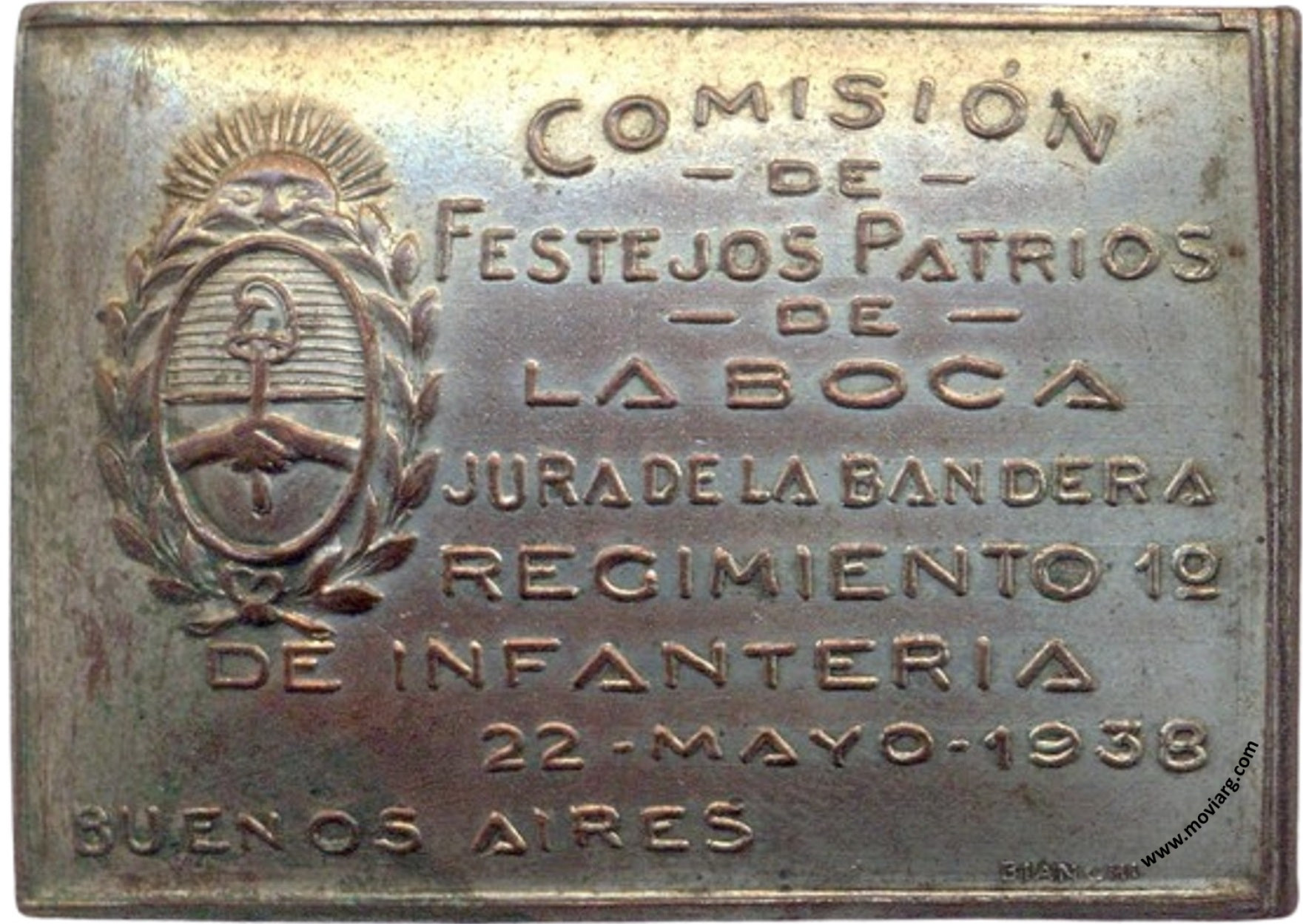 Anverso: COMISIÓN / DE / FESTEJOS PATRIOS / DE / LA BOCA / JURA DE LA BANDERA / REGIMIENTO 1° / DE INFANTERIA / 22 - MAYO - 1938 / BUENOS AIRES. Firma: BIANCHI Reverso: Referencia: | |