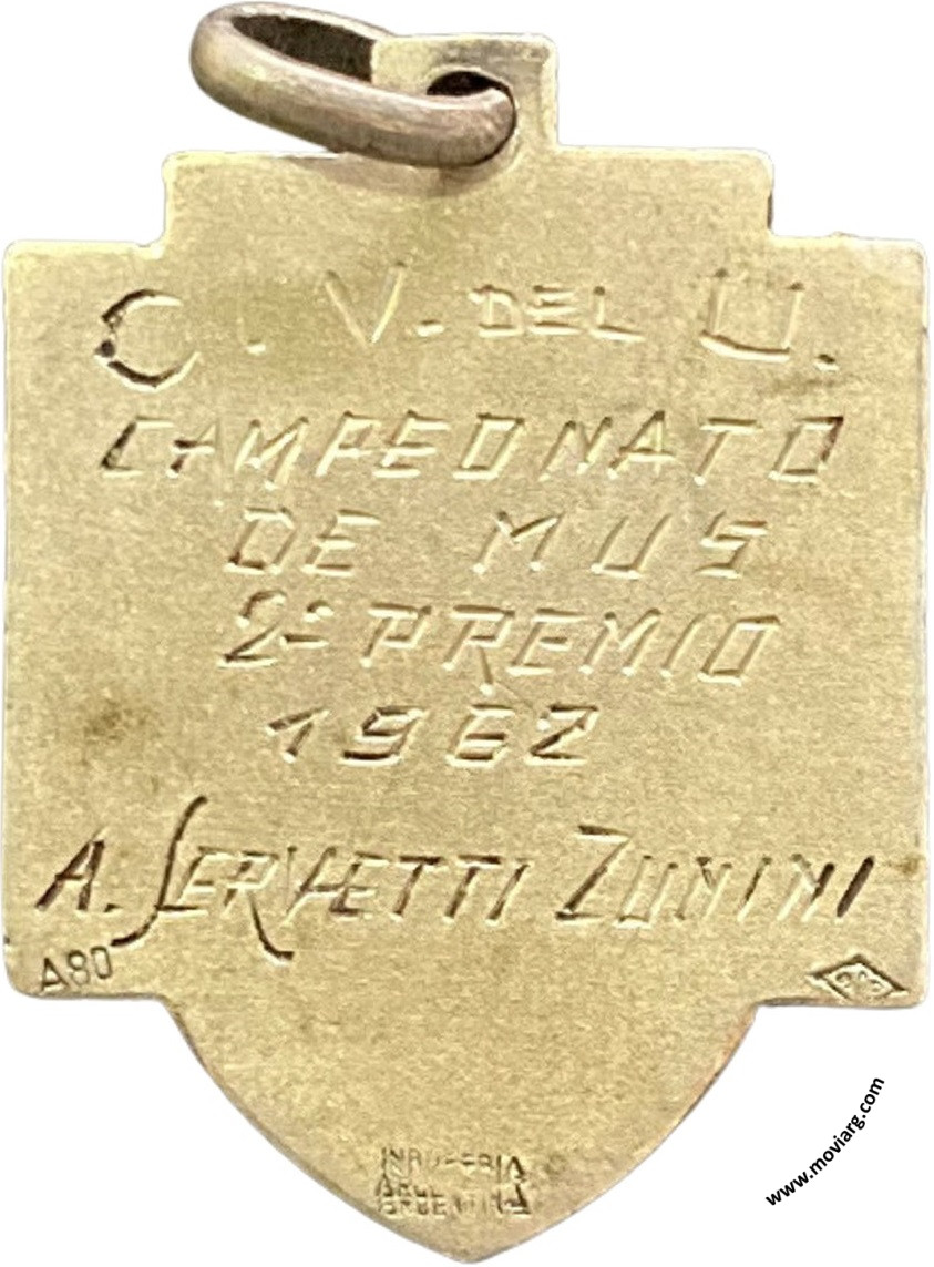 Anverso: Firma: C. B. Reverso: [ C. V. DEL U. ] / [ CAMPEONATO ] / [ DE MUS ] / [ 2° PREMIO ] / [ 1962 ] / [ A. SERVETTI ZUNINI ]. Exergo: [ A80 ] / [ <900> ] / [ INDUSTRIA ] / [ ARGENTINA ] Referencia: | |