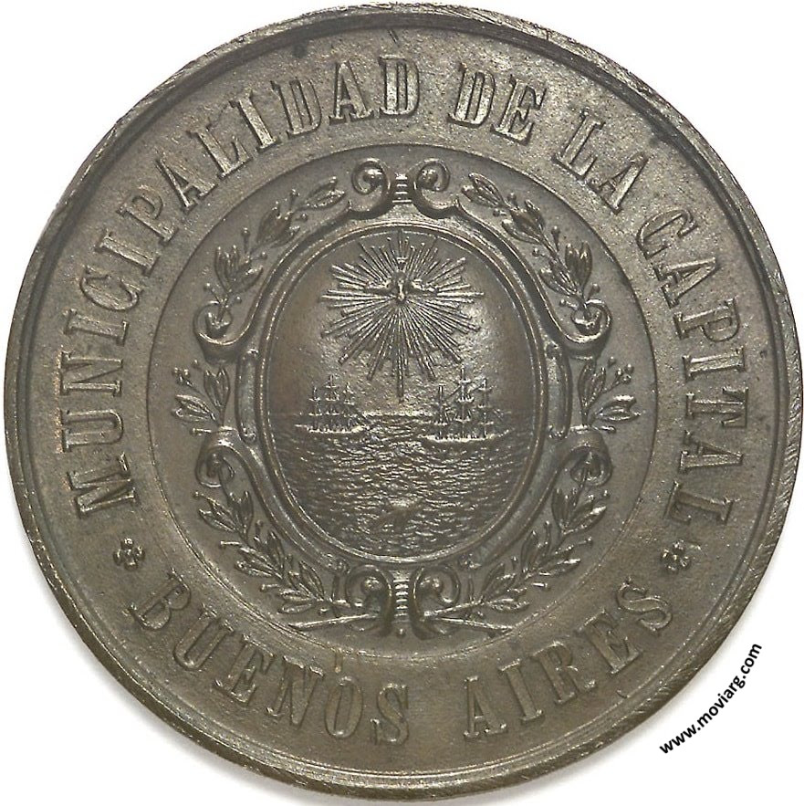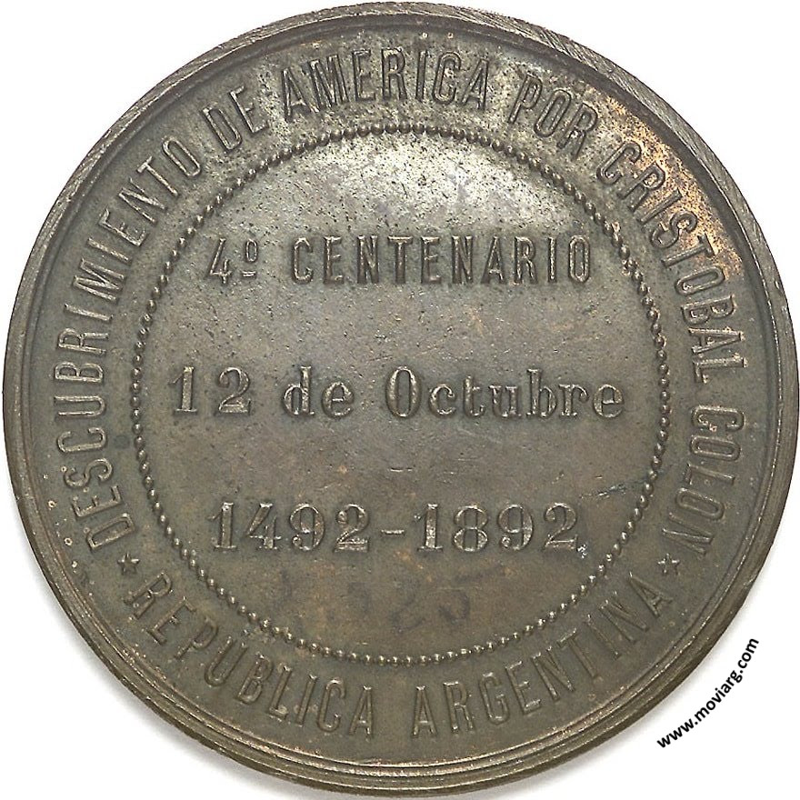 Anverso: MUNICIPALIDAD DE LA CAPITAL / BUENOS AIRES Reverso: DESCUBRIMIENTO DE AMERICA POR CRISTOBAL COLON / REPUBLICA ARGENTINA / 4° CENTENARIO / 12 DE OCTUBRE / 1492 - 1892 Referencia: BURZIO-1606 | |