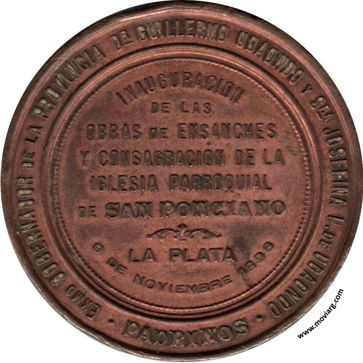 Anverso: CONSAGRADA POR EL EXMO. SEÑOR ARZOBISPO DR. ULADISLAO CASTELLANO. Firma: ORZALI B. Y C. Reverso: INAUGURACION / DE LAS / OBRAS DE ENSANCHES / Y CONSAGRACION DE LA / IGLESIA PARROQUIAL / DE SAN PONCIANO / LA PLATA / 9 DE NOVIEMBRE 1896 / PADRINOS / EXMO. GOBERNADOR DE LA PROVINCIA DR. GUILLERMO UDAONDO Y SRA. JOSEFINA L. DE UDAONDO Referencia: | |