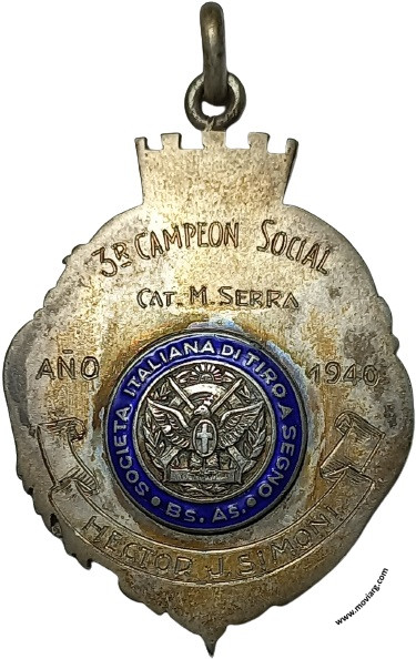 Anverso: Reverso: [ 3R. CAMPEON SOCIAL ] / [ CAT. M. SERRA ] / [ AÑO ] / [ 1940 ] / [ HECTOR J. SIMONI ] / SOCIETA ITALIANA DI TIRO A SEGNO / BS. AS. Referencia: | |