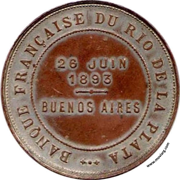 Anverso: PRUDENTIA LABOR PROBITAS Reverso: BANQUE FRANÇAISE DU RIO DE LA PLATA / 26 JUIN / 1893 / BUENOS AIRES Referencia: | |