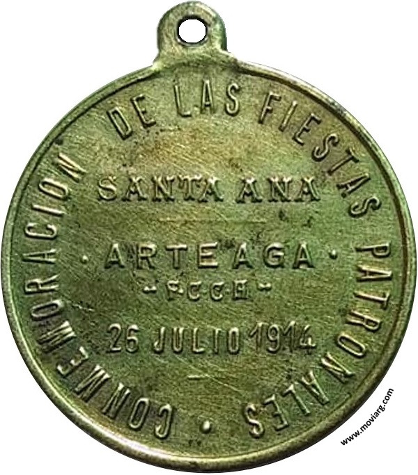 Anverso: [ S. ANA ] Reverso: CONMEMORACION DE LAS FIESTAS PATRONALES / SANTA ANA / ARTEAGA / - F. C. C. A. - / 26 JULIO 1914 Referencia: | |