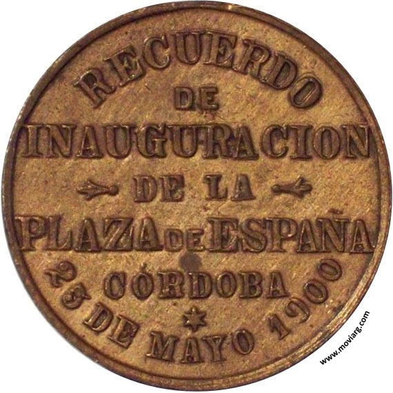 Anverso: FRATERNIDAD / HISPANO - ARGENTINO (sic) Reverso: RECUERDO / DE / INAUGURACION / DE LA / PLAZA DE ESPAÑA / CÓRDOBA / 25 DE MAYO 1900 Referencia: | |