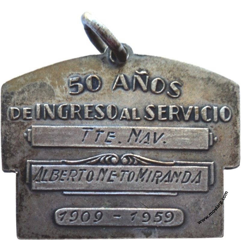 Anverso: ASOCIACION OFICIALES RETIRADOS / DE LAS FUERZAS ARMADAS Reverso: 50 AÑOS / DE INGRESO AL SERVICIO / [ TTE. NAV. ] / [ ALBERTO NETO MIRANDA ] / [ 1909 - 1959 ] Referencia: | |