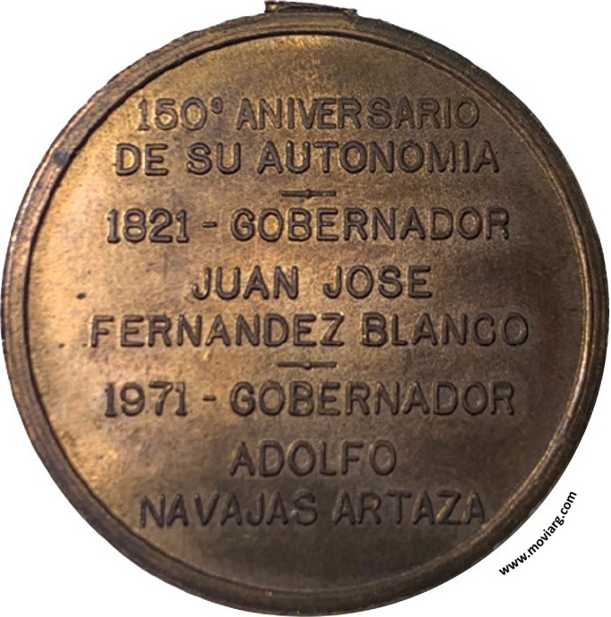 Colección Magnin Anverso: PROVINCIA DE CORRIENTESReverso: 150° ANIVERSARIO / DE SU AUTONOMIA / 1821 - GOBERNADOR / JUAN JOSE / FERNANDEZ BLANCO / 1971 - GOBERNADOR / ADOLFO / NAVAJAS ARTAZA Referencia: | |