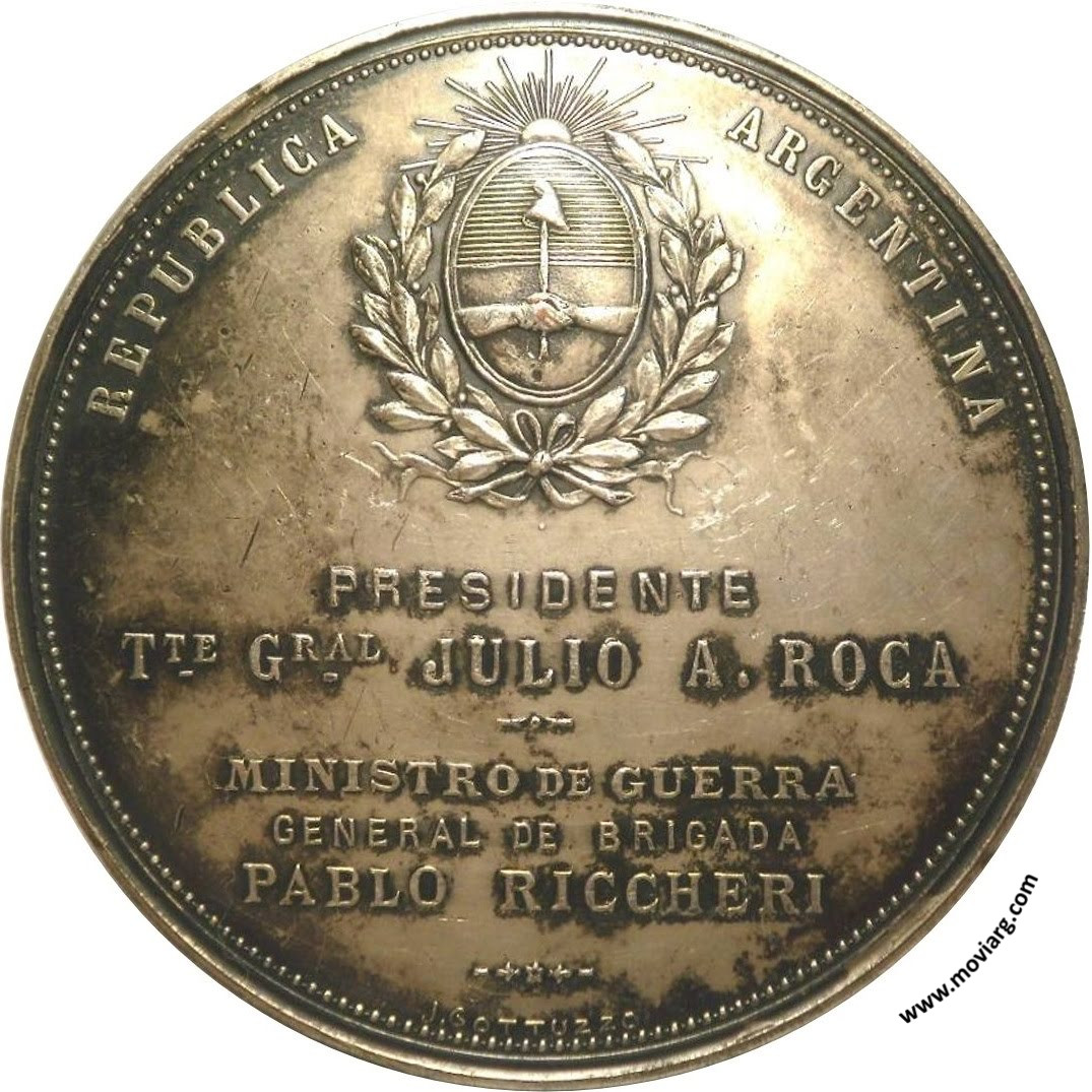 Anverso: ESCUELA MILITAR = COLOCACION DE LA PIEDRA FUNDAMENTAL / CASEROS 5 OCTUBRE 1904. Campo: LEY / 4290. Firma: A. DRESCO Reverso: REPÚBLICA ARGENTINA / PRESIDENTE / TTE. GRAL. JULIO A. ROCA / MINISTRO DE GUERRA / GENERAL DE BRIGADA / PABLO RICCHERI. Firma: J. GOTTUZZO Referencia: | |