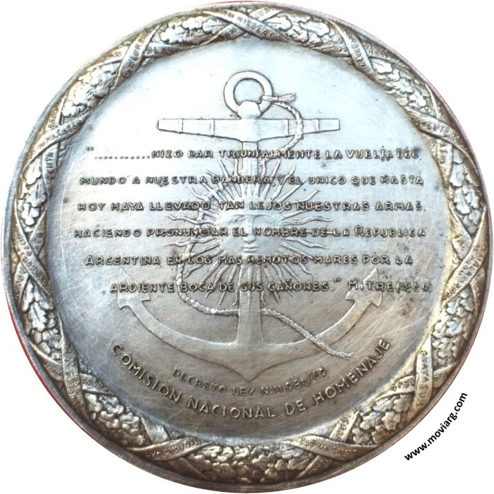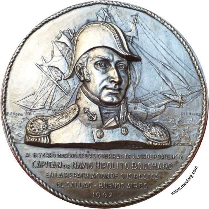 Anverso: AL BIZARRO MARINO DE LAS GUERRAS DE LA INDEPENDENCIA / CAPITAN DE NAVIO HIPOLITO BOUCHARD / EN LA REPATRIACION DE SUS RESTOS / EL CALLAO - BUENOS AIRES / 1962. Firma: P. BUIGUES / EST. PIANA / E. BIGGERI / PATRIZI Reverso: " . . . . . . . . . . HIZO DAR TRIUNFALMENTE LA VUELTA DEL / MUNDO A NUETRA BANDERA Y EL UNICO QUE HASTA / HOY HAYA LLEVADO TAN LEJOR NUESTRAS ARMAS / HACIENDO PRONUNCIAR EL NOMBRE DE LA REPUBLICA / ARGENTINA EN LOS MAS REMOTOS MARED POR LA / ARDIENTE BOCA DE SUS CAÑONES." MITRE (1864) / DECRETO LEY N°11.981/62 / COMISION NACIONAL DE HOMENAJE. Exergo: SAN LORENZO / SAN BLAS / SAN NICOLAS / SAN JUSTO / ... Referencia: | |