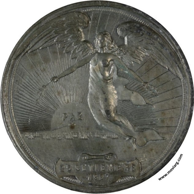 Biblioteca Nacional de Uruguay Anverso: 25 SETIEMBRE / 1897. Campo: PAZReverso: RECUERDO DE LA PAZ / REP. ORIENTAL DEL URUGUAY. Firma: A. BIDOGLIA CANGALO 1061 B.A. Referencia: | |