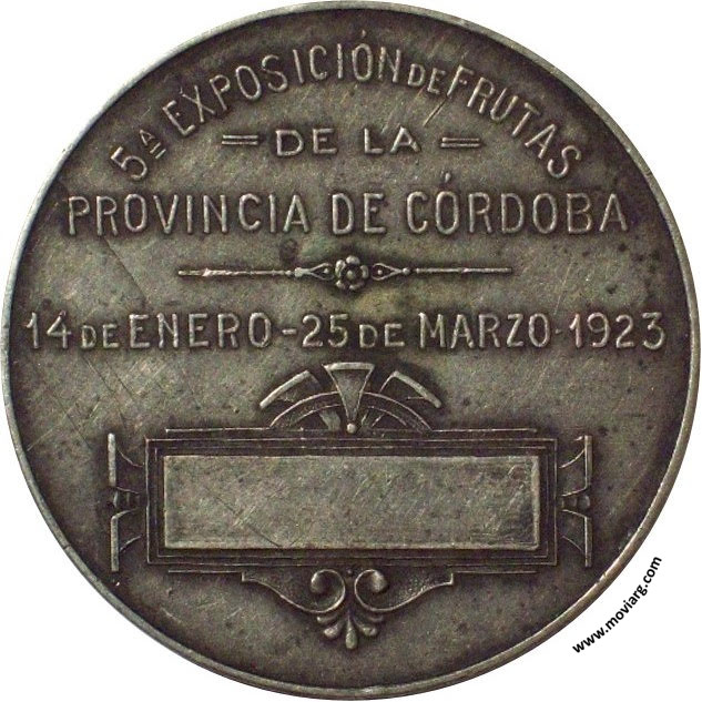 Anverso: Reverso: 5A. EXPOSICIÓN DE FRUTAS / DE LA / PROVINCIA DE CÓRDOBA / 14 DE ENERO - 25 DE MARZO 1923 Referencia: | |