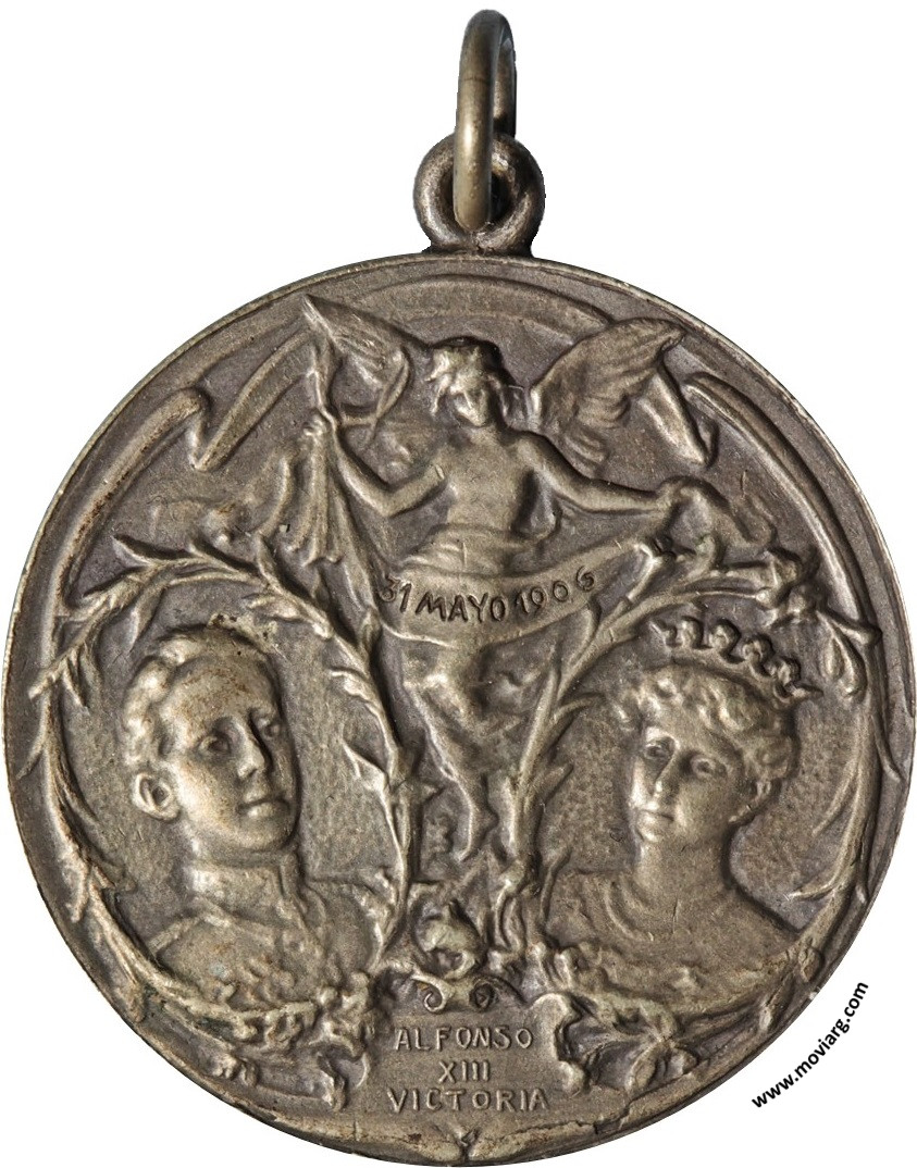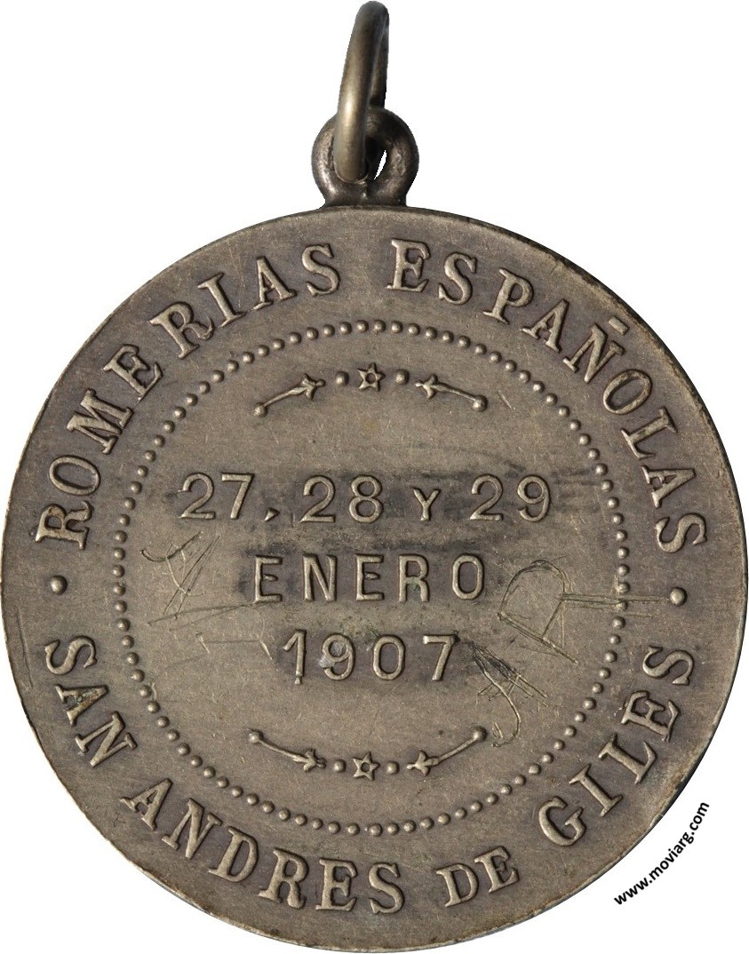 Anverso: ALFONSO / XIII / VICTORIA. Campo: 31 MAYO 1906 Reverso: ROMERIAS ESPAÑOLAS / 27, 28 Y 29 / ENERO / 1907 / SAN ANDRES DE GILES Referencia: | |