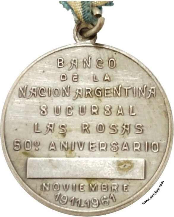 Anverso: Firma: M.F. Reverso: BANCO / DE LA / NACION ARGENTINA / SUCURSAL / LAS ROSAS / 50° ANIVERSARIO / NOVIEMBRE / 1911 . 1961 Referencia: | |