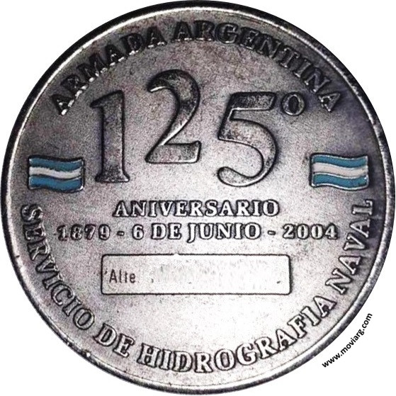 Anverso: ARMADA ARGENTINA / SERVICIO DE HIDROGRAFIA NAVAL. Campo: REPUBLICA ARGENTINA / HIDROGRAFIA Reverso: ARMADA ARGENTINA / SERVICIO DE HIDROGRAFIA NAVAL / 125° / ANIVERSARIO / 1879 - 6 DE JUNIO - 2004 Referencia: | |