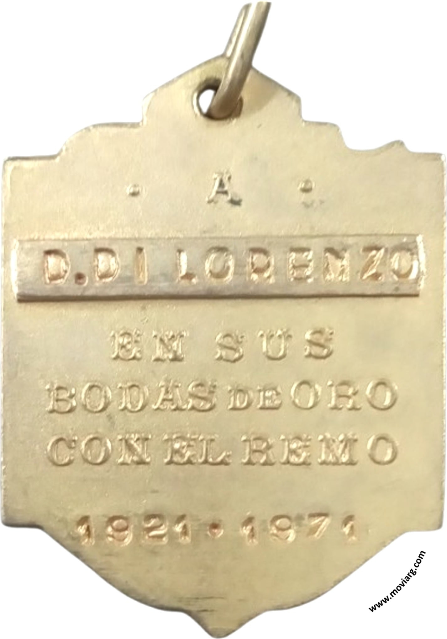 Anverso: COMISION / REGADAS / RIO PARANÁ. Campo: CR / RP. Firma: TALL. O. GALLO Reverso: A / [ D. DI LORENZO ] / EN SUS / BODAS DE ORO / CON EL REMO / [ 1921 · 1971 ] Referencia: | |